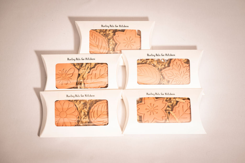 Size: Each Pantry Pal is roughly 2" - 2 1/2" in diameter (depending on shape). You will receive two (2) Pantry Pals with each order of differing designs. All designs are nature inspired and could be a leaf, flower, or bee form.